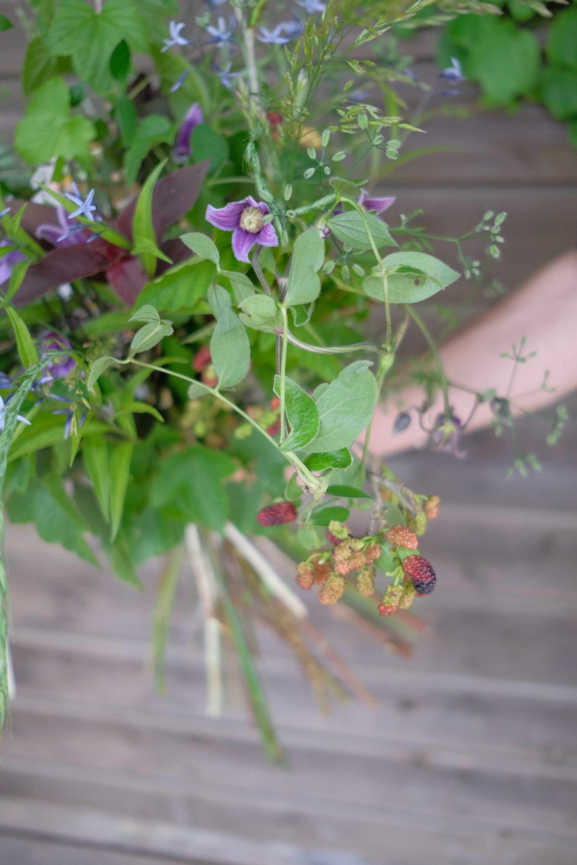 森に囲まれた畑で、季節の花や草木を自分の手で摘み取ります。